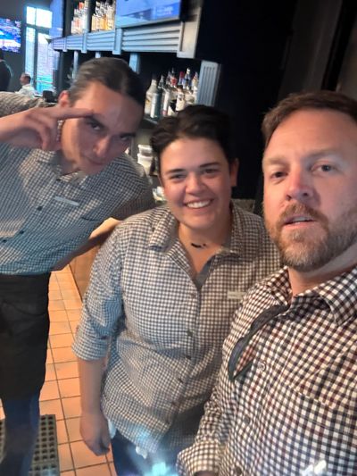It felt like a 300-pound man pushing against my jaw—we took a picture. I didn’t want to overstay my welcome, so I slipped back into the waiter role I’d been assuming. A gal walked by and dropped a fork, so I picked it up, followed her to the bar, thanked them for their time, and left.